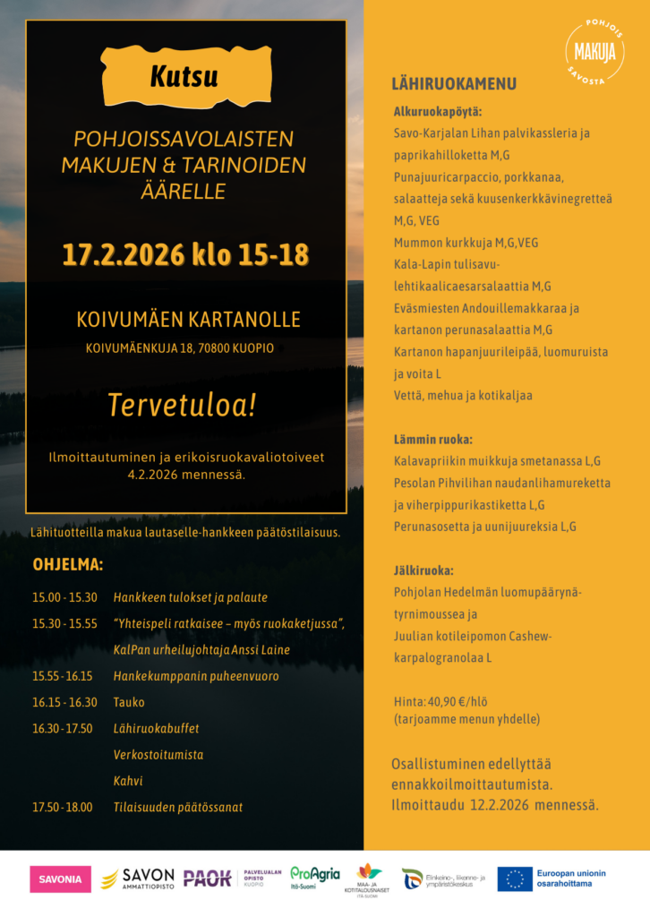 Tervetuloa Lähituotteilla makua lautaselle -hankkeen päätöstilaisuuteen tiistaina 17.2.2026 Koivumäen Kartanolle.